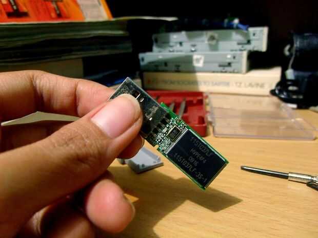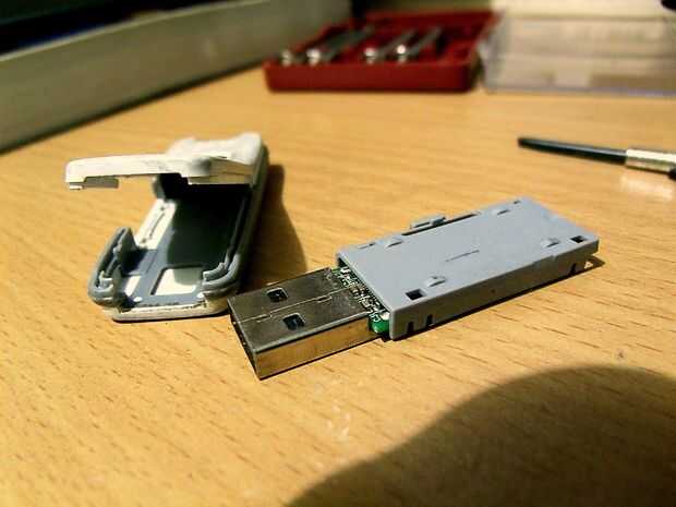 Desmontar cuidadosamente su unidad flash USB hasta el circuito de memoria finísimo.