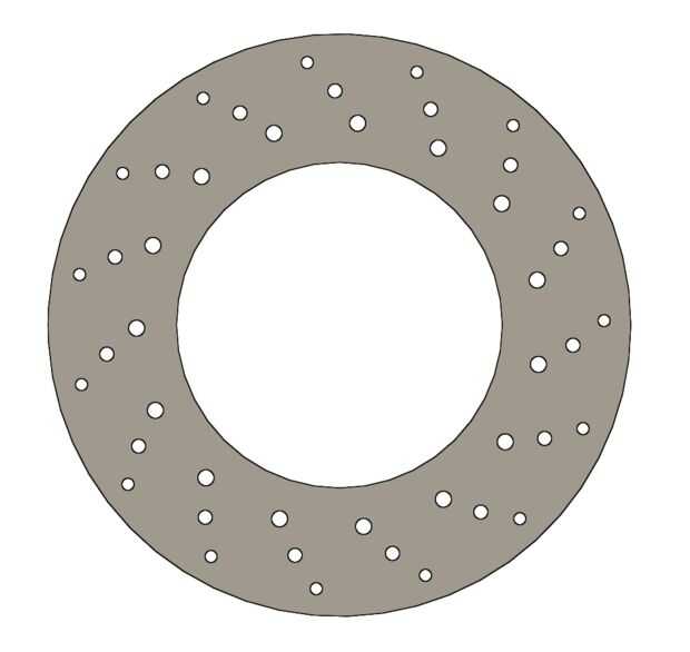 La matriz de agujeros son 8mm, 7mm y 6mm de diámetro. (matriz circular de 15, optimizado por simulaciones del flujo). Estos orificios, a diferencia de los diseños de disco de rotura más habituales, no van a través de las hojas internas. Los agujeros ventilan el flujo de aire como se describe en el paso 3.