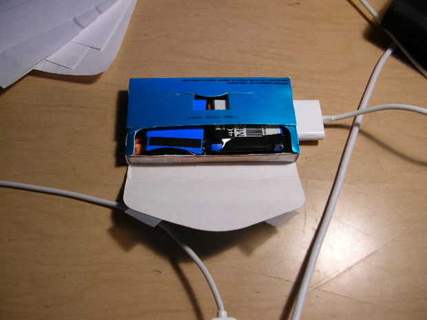 Originalmente, como se puede ver en las fotos, he usado un estuche de cartoncillo simple scotch pegada juntas para sostener el dispositivo. Hizo el truco, pero seguí teniendo que cortar la cinta scotch para mostrar mi obra. Demasiado trabajo.