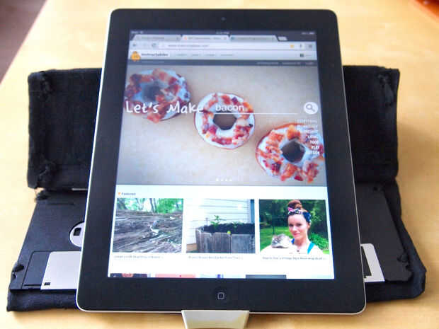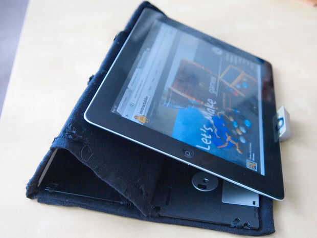 Tomé un enfoque ligeramente diferente en el montaje de mi manga, primero coser el material y cosidas directamente los discos en. Me di cuenta al hacer mi bolso, que también pude convertir en un soporte sobre la aleta delantera y acuñamiento entre las dos filas de discos en la parte posterior (tipo de mi propia versión de una cubierta inteligente del Ipad).