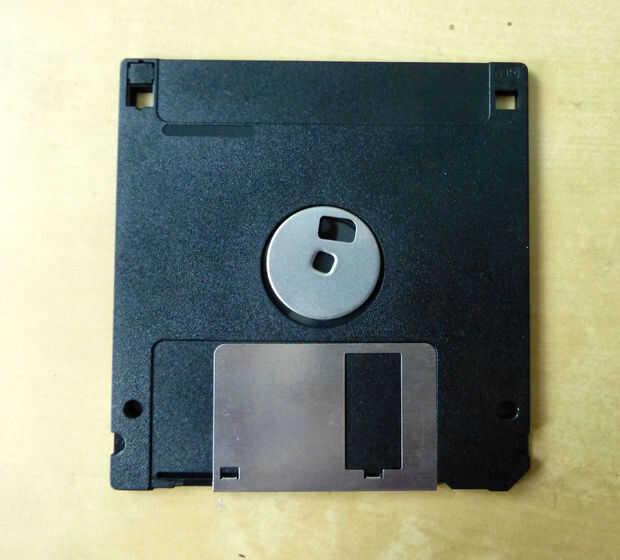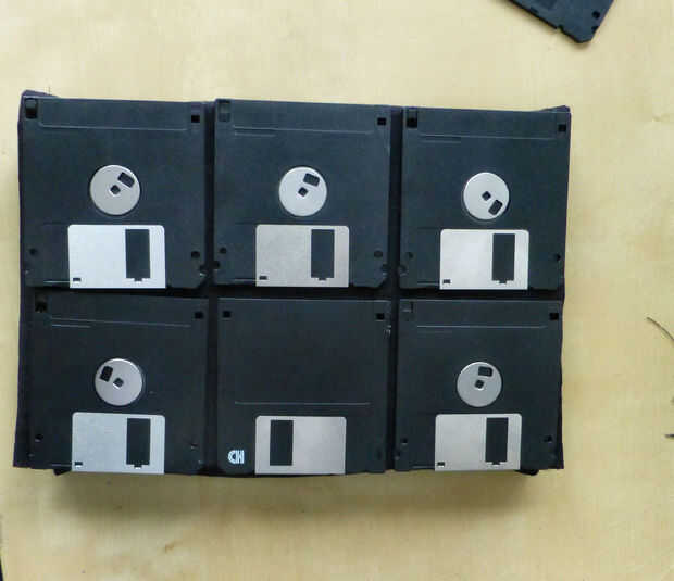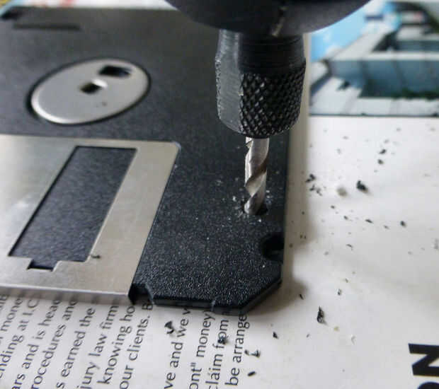 Seis disquetes caben en la superficie anterior y posterior de la manga.  Necesitaba dos agujeros a cada lado del disco, he usado el orificio existente para la protección contra la escritura y dos agujeros perforados en la parte inferior (donde ya hay un guión).
