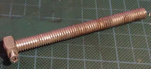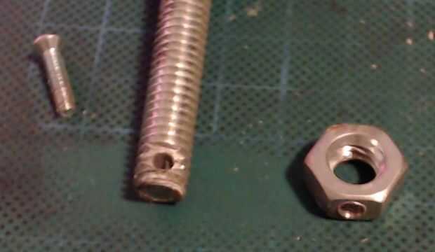 Yo primero aplana la parte inferior de la varilla roscada de 5mm y había perforado un agujero para el perno M4 luego perforó un agujero en una de las caras de la tuerca de 5/16" y rosca para el M4.