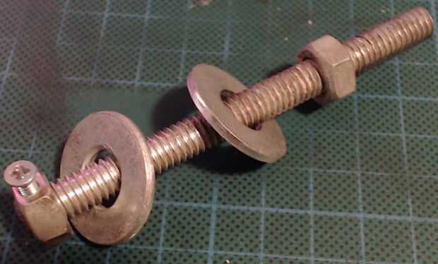 La varilla roscada se hizo lo suficiente para adaptarse a los discos y las 2 arandelas y 2 tuercas y dejar suficiente longitud de sobra para encajar en el portabrocas del taladro (he dejado 5cm).