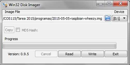 Para grabar dicha imagen en la tarjeta SD se utilizó el programa Win32 Disk Imager descargado de la dirección: http://sourceforge.net/projects/win32diskimager/