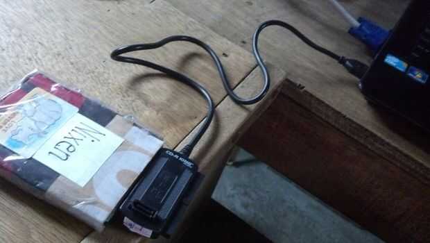 Nintendo un gameboy original roto en una caja de disco duro. La luz se enciende cuando disco duro está conectado y parpadea cuando se están transfiriendo datos. El gameboy se dobla como una manera fresca para almacenar un juego de gameboy que volvió