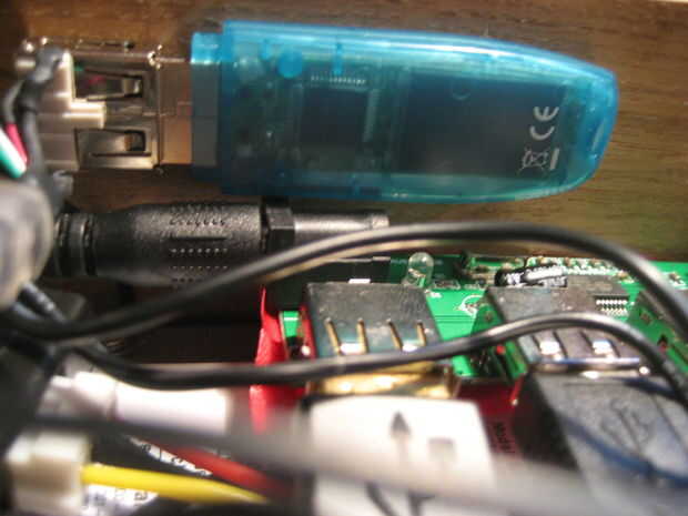 Conecte un lado del cable USB con el interruptor de láminas del concentrador USB y conecte el otro extremo a la unidad de flash. La unidad flash al lado de la caja del pegamento.