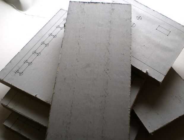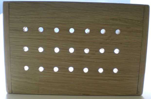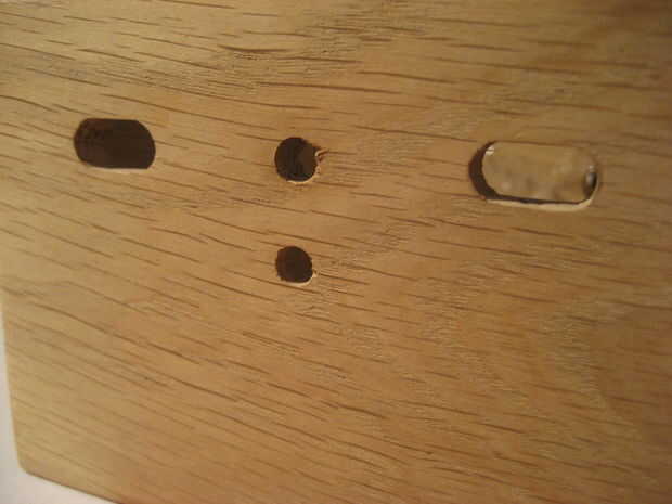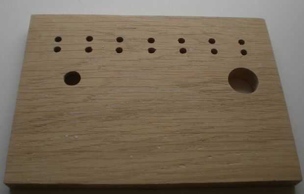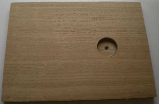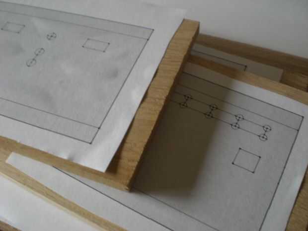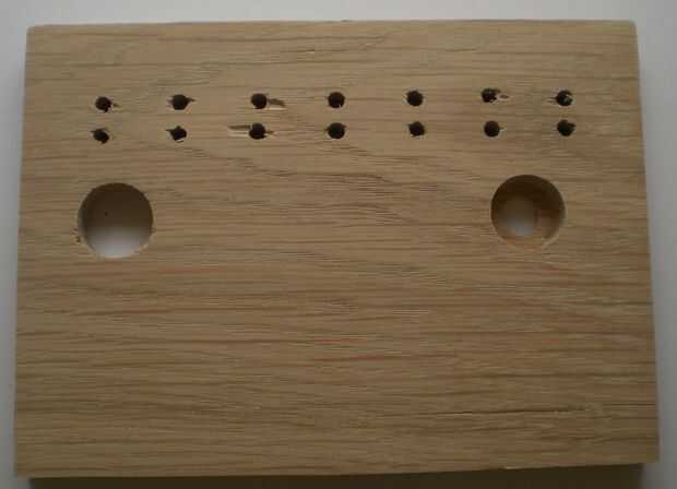 Perfore agujeros en las marcas internas con la broca correspondiente (por ejemplo si una marca es de 6 mm, perfore un agujero con una broca de 6 mm). En la tabla de madera que se convertirá en la parte posterior del hueco de la caja del agujero de 8 mm con una broca de 20 mm. El agujero hueco hacia fuera tiene que ser de 6 mm de profundidad.