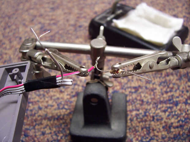 Recuerde cuando se suelda, no derrita la soldadura directamente con la plancha, ya dará como resultado una soldadura fría. Desea que la soldadura derrita en los cables, así que calientan los cables hasta ver un poco de humo, luego tocar la soldadura para los cables y fluirá en ellos.