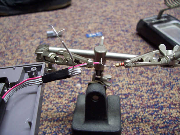 Las fotos son bastante autoexplicativas, pero básicamente yo soldado 1. cable rojo a resistencia, 2. resistencia a la pata positiva del LED, 3. pata negativa del LED al cable de conexión, 4. alambre a la pata positiva del segundo LED, 5. etapa negativa de segundo LED al otro cable y 6. otro cable al cable de tierra.