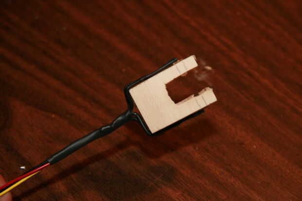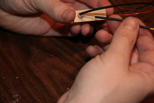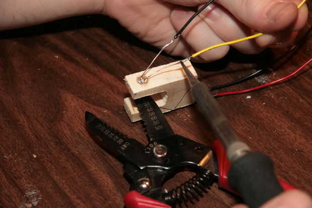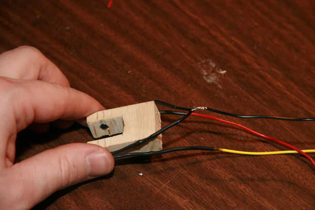 Soldar un cable negro con el plomo del ánodo del emisor. El ánodo es el más corto de los dos cables, mientras que el cátodo es el más largo. Con el segundo cable negro, lo mismo para el transistor de la foto. El tercer cable (rojo en la imagen) al cátodo del emisor de la soldadura. Suelde el cable cuarto (amarillo en la imagen) al cátodo del foto transistor.