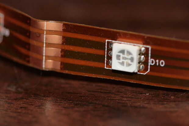 La cinta LED se puede separar en grupos de tres. Corte una sección de tres grupos. La cinta no se separan en tres grupos. Desea un pedazo de cinta con nueve LEDs. Esto debe dejar un espacio razonable para el sensor de plato, donde la Asamblea de la lectura y escritura utilizada para sentarse. Asegúrese de que usted corte la cinta en la línea entre lengüetas de cobre, o bien puede severas huellas internas haciendo inútil la sección afectada.