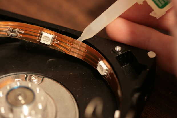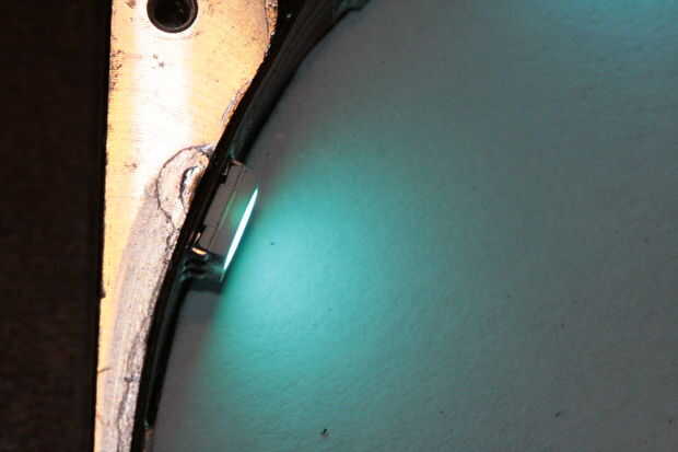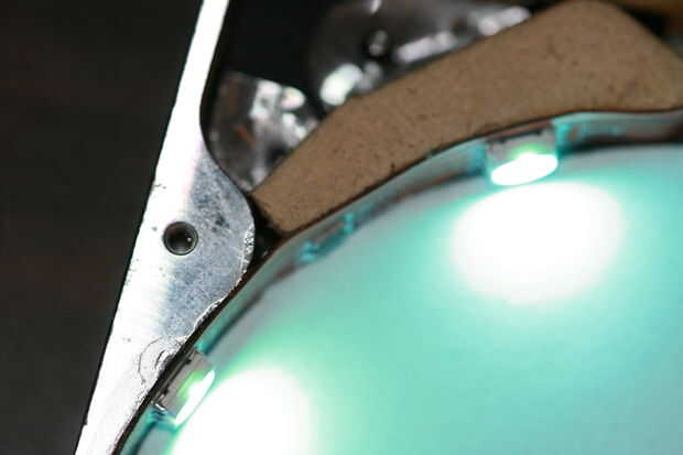 Al poner los LEDs, no confías en el respaldo de la etiqueta engomada proporcionado por el fabricante. Simplemente no es lo suficientemente fuerte. Conseguir algún pegamento y pegar lentamente la tira a la pared de la cámara, presionando firmemente cuando proceda. Es imperativo que los LEDs se fijan como recto y al ras posible, así que trabajar lenta y cuidadosamente.