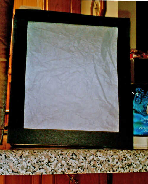Fuentes: 1 caja de cartón 1 al azar LED light-up oliday 1 hoja de papel de estaño 1 hoja de papel de tejido 1 hoja de papel de construcción, tablero de cartel o tablero de estera que se coloca sobre la abertura de la caja. También se puede utilizar un marco estera precortado. Cinta tijeras