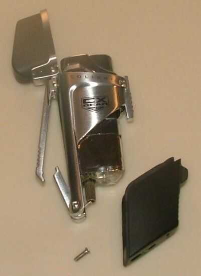 Desenroscar la parte inferior del encendedor y quitar las tripas de la carcasa. Hay sólo un tornillo. despegará del plástico del fondo negro. Luego las entrañas saldrá solo. todo sale como una sola pieza. puede guardar las partes más ligeras para otro proyecto. (el botón pieso de chispa debe funcionar muy bien para su próximo proyecto de Spud Gun, etc..