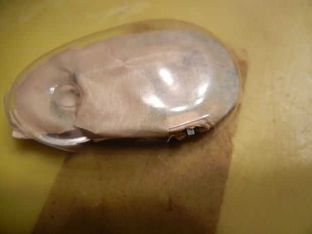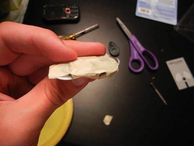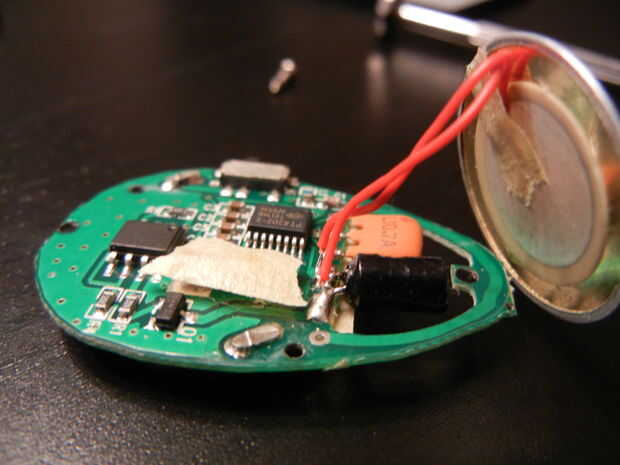 Este paso es bastante sencillo, sólo queremos hacer la parte del buscador clave más pequeña posible. Quitó la carcasa con un destornillador y luego la electrónica en una fina capa de papel de seda y cinta para proporcionar algún apoyo para el impacto. Desea guardar el disco piezoeléctrico (o altavoz) como abierto como sea posible para maximizar el sonido. Guardé la parte de plástico del embalaje y corte hacia abajo para un poco más protección para nuestro generador de ruido minúsculo.