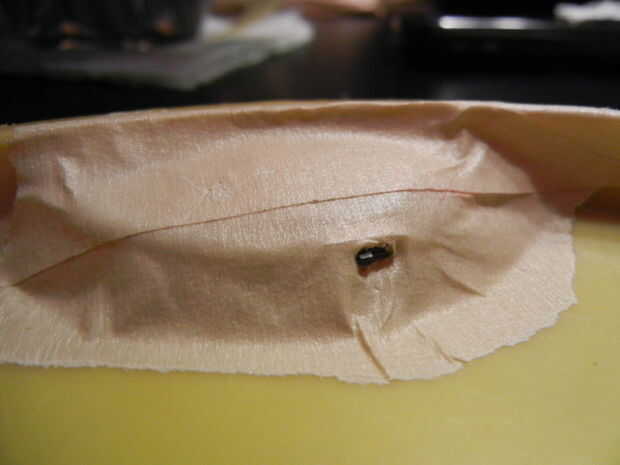 Como puede haber adivinado el último paso es hacer el buscador dominante en la sección de eviscerado de la llanta. Simplemente hice esto con alguna cinta de enmascarar como quería mantener el buscador dominante desmontable por lo que podría modificar este diseño en el futuro. No hay ningún revés para colocar el buscador, sólo trate de mantener tan ligero como sea posible con la cantidad mínima de la cubierta sobre el piezoeléctrico. Guardé una pequeña sección cortado cerca del interruptor de encendido/apagado y altamente te recomiendo hacer lo mismo.