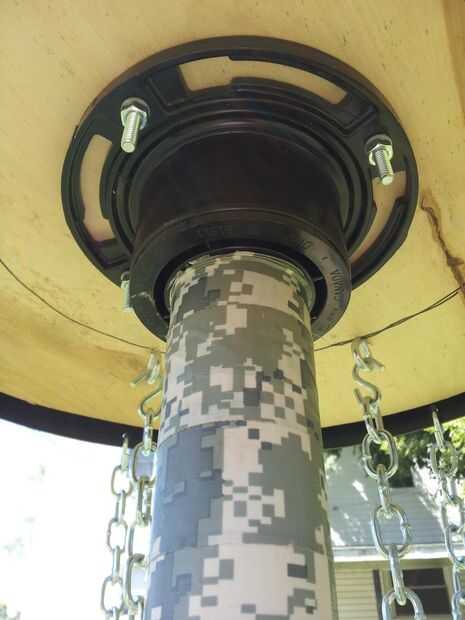 Por lo que tendrás una pieza de conexión de PVC en el Paragüero, y en la parte superior que se ajusta en la brida (primera foto). La cesta se sentará en la primera pestaña, y otra pestaña se colocará dentro de la canasta, directamente sobre la brida del primera, por los tornillos hexagonales y arandelas/tuercas de debajo de ellos (segunda foto). El otro trozo de PVC entonces entra en la pestaña dentro de la canasta y suben a la parte inferior de la madera en la parte superior (tercera foto). Asegure la brida superior en la madera usando los 4 pernos, arandelas y tuercas.