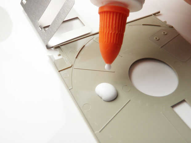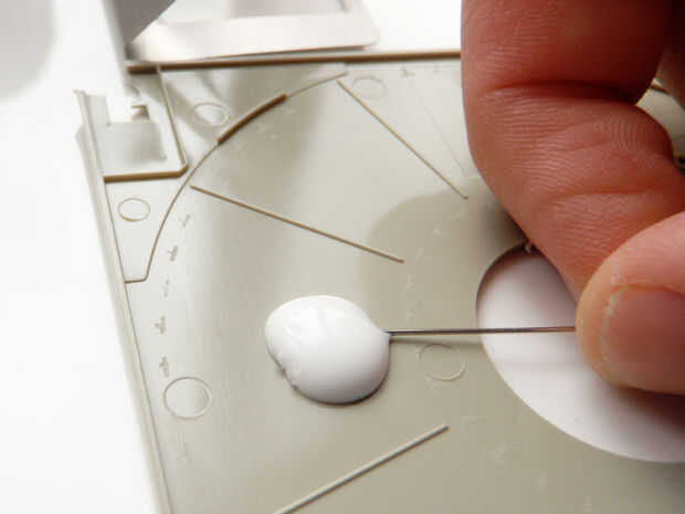 Usando su pin, coloque unas diminutas gotas de pegamento en cada esquina para sujetar en su lugar.