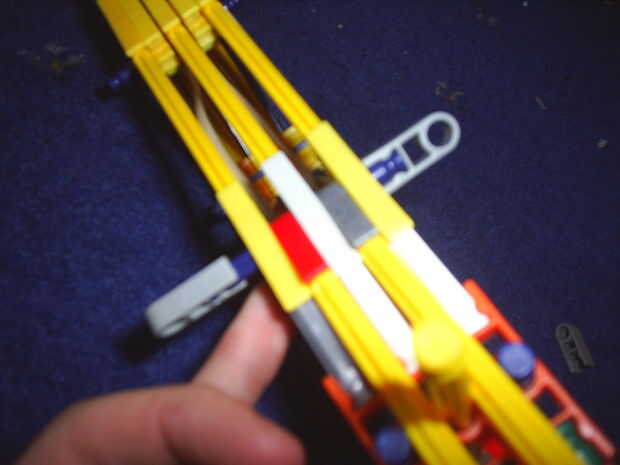En primer lugar retire el conector gris de la parte superior de las dos barras amarillas y empujar el gatillo hacia arriba bettween las 3 partes del cuerpo y añadir una barra azul con 2 conectores gris cada lado como se muestra abajo (recordar añadir la pieza en que sacó al comienzo de después de)