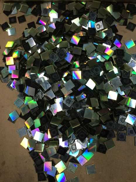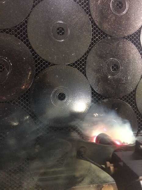 LOS LÁSERES SON DIVERSIÓN. Comenzar colocando el lado embotado de CDs para arriba en el cortador del laser. Es mejor anotar sólo la superficie de los CDs en lugar de cortar a través de todo el camino. Necesitará romperlas aparte en cuadrados más adelante, pero también evitar desagradables quemaduras en el lado brillante de los discos.