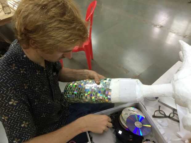 Inicio pelado apagado la capa de la cinta adhesiva y la aplicación de las plazas. Dependiendo de la curvatura de la forma y el tamaño de tus plazas puede que necesite hacer algunos de ellos en formas divertidas. Te recomiendo sólo descubrir pequeñas zonas de la cinta a la vez para mantener el resto pegajoso mientras trabajas.