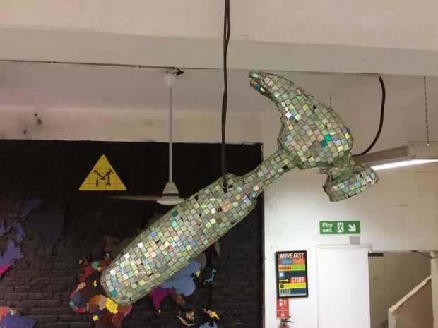 Me olvidé de tomar fotos del método de ahorcamiento, pero es fácil. Antes de empezar a pegar los cuadrados, hacer un agujero y poner un tubo de PVC lo pensado. Una vez que se hace se puede colgar para arriba por pasar una cadena a través del tubo.