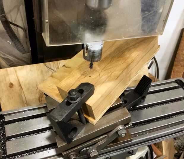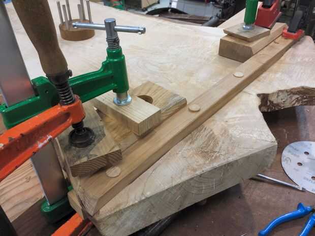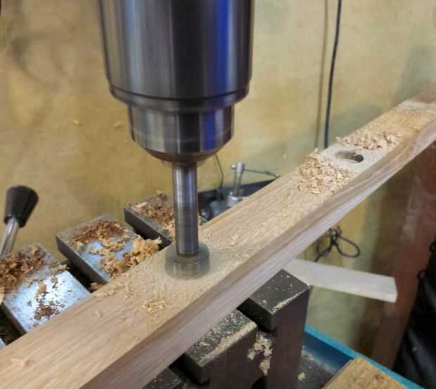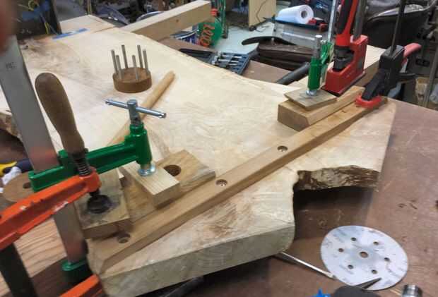 Comencé a planificar todo, sosteniendo cosas en diferentes ángulos y ver cómo se veían. Cuando feliz perforé un orificio angular en un bloque de roble, con una sierra. Esto actuaba como una guía de soporte y perfore los agujeros que tenía que hacer en la losa de en la parte inferior la pierna... Ver información sobre la foto para más detalles,
