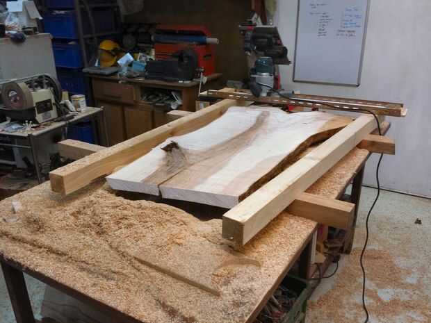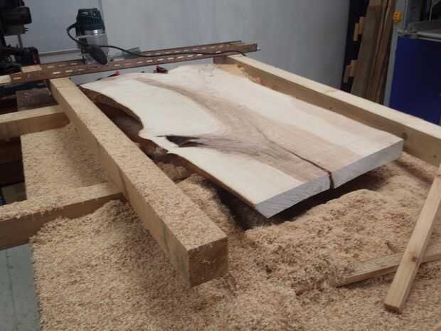 Lo primero es lo primero aunque permite conseguir algo plana. Esta losa es muy un poco demasiado grande para caber a través de la cepilladora, así que hice el trineo rudimentario del router que se puede ver en las fotos. Era escéptico, pero aparte de ser terriblemente desordenadas (piensa en virutas de madera abajo los pantalones y en unidad de dvd del ordenador) y un poco lentos, realmente funcionó muy bien.
