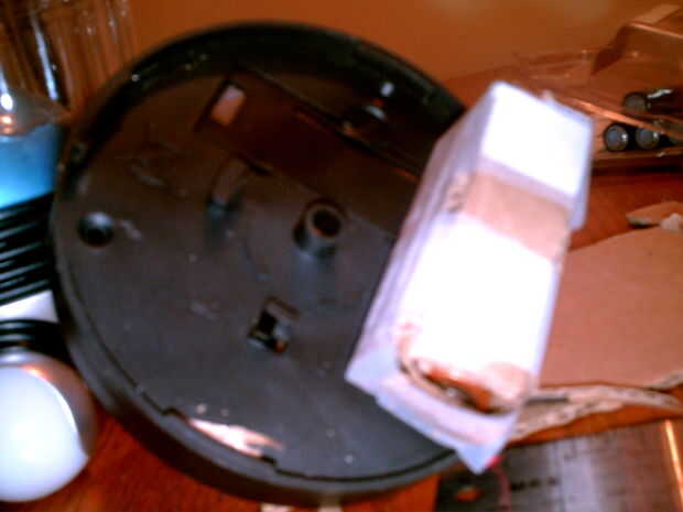 Recientemente, una tormenta de viento fuerte sopló una de nuestras luces solares decorativas rompiéndolo en el suelo fuera de la puerta. Siendo el protector de cadena consumado, no podía simplemente desechar que un perfectamente bien roto por la luz solar. Descubrí que incluso sin el panel solar, la luz LED dentro todavía funcionaba con el uso de una batería AA. El panel solar se había ido así como la mayoría de la cubierta exterior dejando sólo una circular base, LED luz, tablero de un pequeño circuito con un interruptor on-off y los conectores de la batería sin la caja de la batería. Por casualidad, descubrí que esta base circular de la luz LED encajan perfectamente dentro del contenedor de muffin que haría el cuerpo de robots.