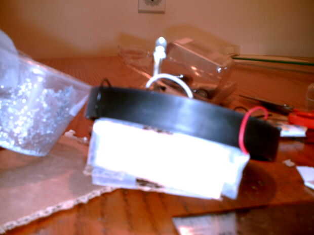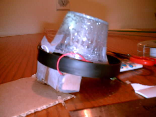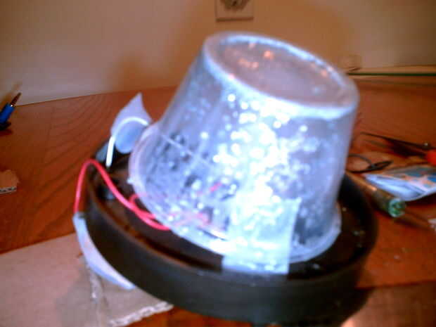 La pequeña luz de LED que he utilizado para el interior del cuerpo del robot es necesario una pequeña cubierta para difundir la luz. Como la sombra de la luz al aire libre era demasiado grande para caber dentro de la caja de plástico pequeña del envase muffin, usé un vaso de plástico. Me acaba de pasar a trabajar en un cartel para la fiesta de cumpleaños de mi sobrina que requería el uso de brillo (cosas sucias).  Llena un vaso de plástico pequeño con el brillo y el pegamento para aplicar al cartel y dejó la taza hacia fuera durante la noche.  En la mañana, el brillo se ha adherido a los lados de la taza de crear una copa espumosa que era todavía transparente.  En lugar de tirar a la taza, usé el vaso de plástico para cubrir la luz del cuerpo del robot.  Yo simplemente graba la Copa boca abajo sobre parte superior de la luz.   Tuve que recortar la Copa de algunos por lo que encajaría perfectamente dentro del contenedor vacío muffin cuando la unidad entera fue colocada dentro del cuerpo del robot.