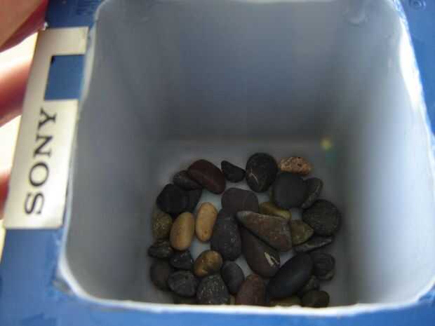 Puesto que no hay agujeros de drenaje en la maceta he añadido una capa de grava y un carbón de leña activado en la parte inferior.  Transplantan una pequeña planta en la maceta.