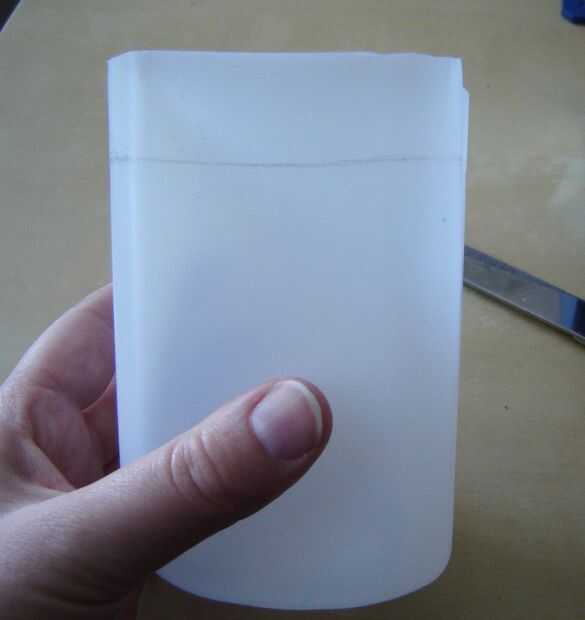 Inserte el forro en el disco con el orificio y coloque encima el cubo.  Asegúrese de que el liner esté colocado todo a través de que está sentado en la parte inferior del cubo.  Marque la altura donde el borde superior del cubo alcanza el trazador de líneas.  Corte a lo largo de esta línea.  El forro debe quedar al ras con la parte superior del cubo.