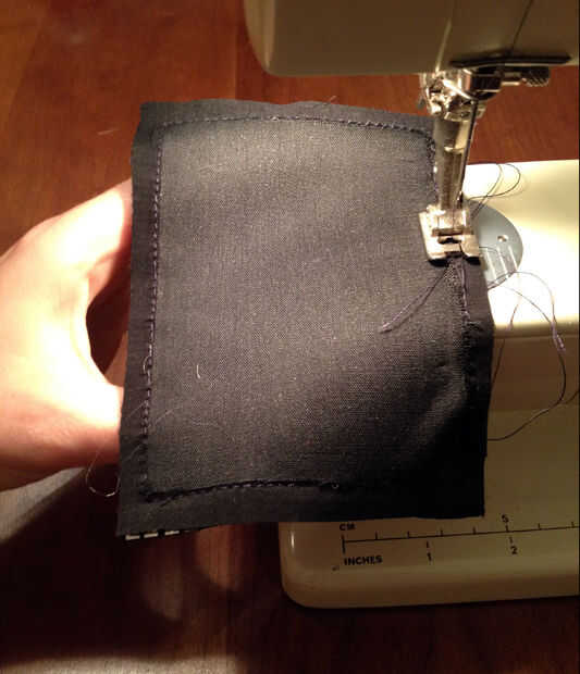 A continuación, coser sus rectángulos de dos tela juntos, cara lados hacia adentro, como si fuera una funda de almohada. La línea de costura debe ser en el borde de su interfaz (yo usé un margen de costura de 1/4"). Se necesita dejar un ~ 1" gap para tire de lado derecho hacia fuera, que mejor se posiciona en el centro de uno de los lados largos del rectángulo.