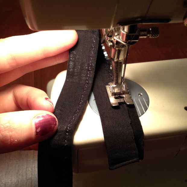 Su tira de 1.5" doblar la mitad, hacia adentro del lado de cara y coser 1/4" en de los bordes. Usé un leve zig zag porque la tela disco tiene algún tramo y no quiero poner tensión en el hilo. Cuando haya terminado la costura, coloque un alfiler hasta el final y utilizar a su derecha de correa.