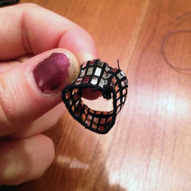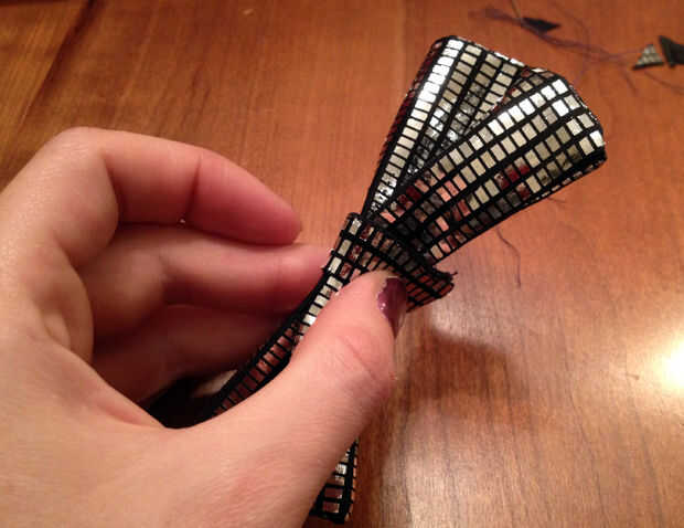 Con su recién cosida tira de tela, miden alrededor del arco doblado y corte una sección suficientemente grande como para envolver alrededor de la proa. Coser juntos para crear el bucle en el centro de la corbata y deslizarla alrededor del arco.
