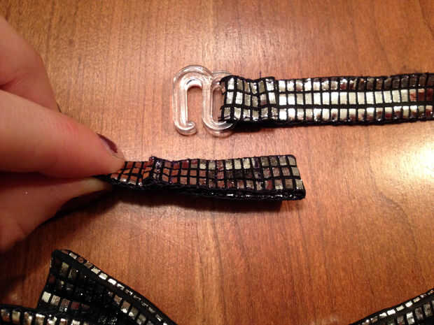 Tiempo para poner los toques finales. Sujetar el gancho a una final, doblando la correa por debajo y coser hasta dar un borde limpio. En el otro lado, he doblado la correa hacia atrás y había hecho tres líneas de costura dentro de la superposición, doblando el borde bajo. Esto crea tres opciones de dónde colocar el gancho para permitir alguna variación en la tensión.