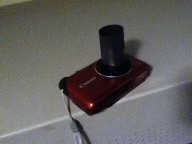 Envolver firmemente alrededor del cañón y cinta adhesiva en su lugar. El siguiente es la parte difícil. Tratar de cortar el tubo a no más de 1/4" más allá de la lente. El filtro debe ser lo más cercana posible a la lente para conseguir el mismo campo visual al llegar sin el filtro. Una vez se recorte y grabado juntos, llevarlo fuera de la cámara y pegamento para el filtro. Deje que se seque.