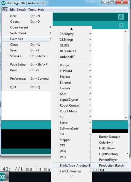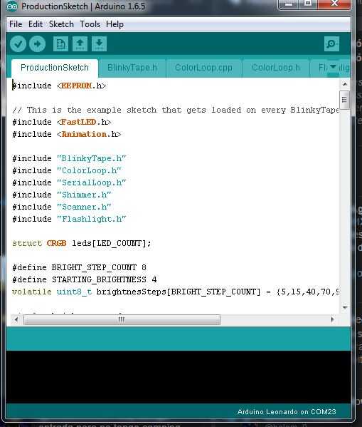La manera mas fácil de instalar las librerías es con el incluyen Biblioteca-agregar biblioteca de Zip, una vez instalado reiniciamos el IDE de Arduino e iremos a la seccion de ejemplos--> BlinkyTape--> ProductionSketch en este boceto podemos modificar el numero de leds vamos a controlar, así como algunos otros detalles como botones extras o entradas analógicas, en mi caso solo modifique el numero de neopixeles un y usar cargamos al Arduino Micro con esto ya tendremos el versión parcial de programa con el viene pre cargado todo BlinkyTape eso hora de jugar