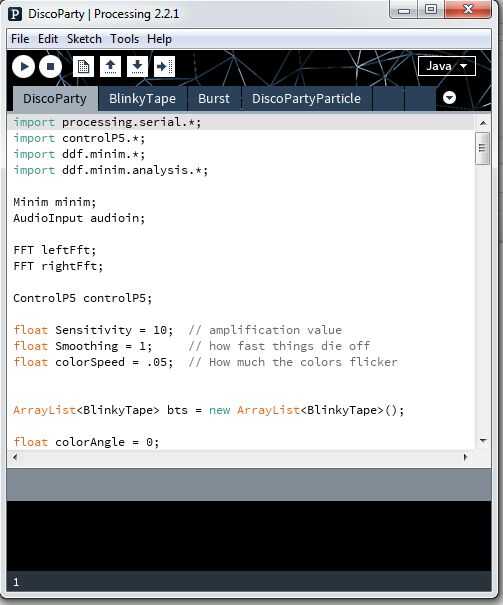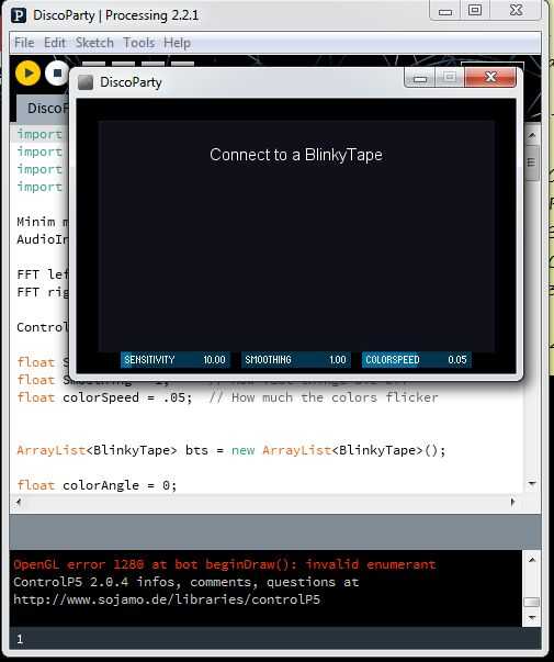 Descomprimimos el zip y vamos a la carpeta de ejemplos ahí encontraremos el ejemplo DiscoParty.pde lo abrimos desde procesamiento, seleccionamos el numero de leds una propuesta, conectamos el Arduino y presionamos el botón ejecutar.