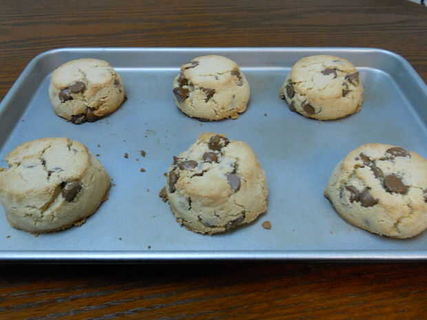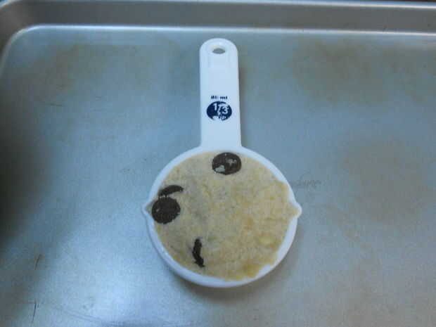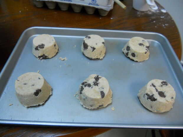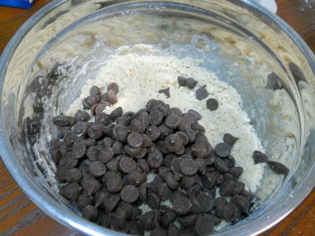 Mezclar todos los ingredientes excepto mini-besos y la harina juntos. Doble en harina y luego agregar los mini-besos. Paquete de 1/3 taza con la masa para obtener la forma de disco necesario. Hornear en el estante del centro durante 18 minutos. Deja enfriar por 3,3 minutos antes de comer con helado.