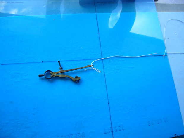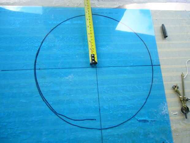 Sus medidas es muy fácil: marca del centro del círculo mediante la medición de su radio (además de una pulgada o tan para la seguridad) de ambos lados de su plástico, luego hacer una cruz como se muestra.