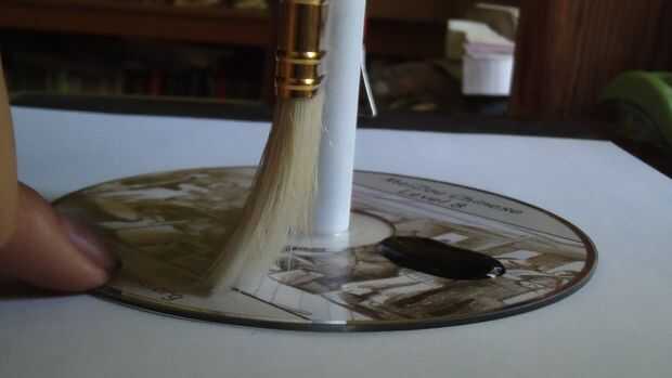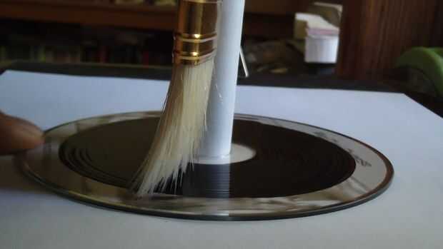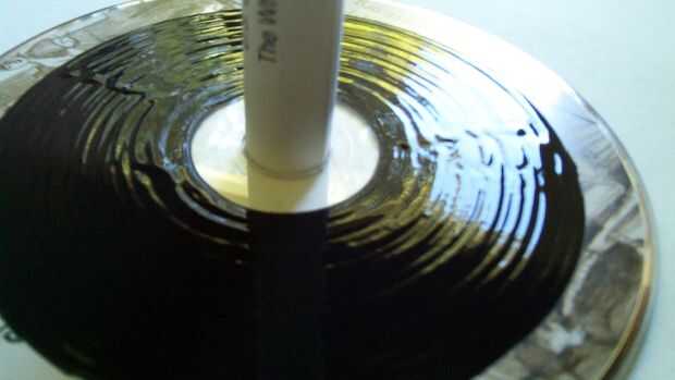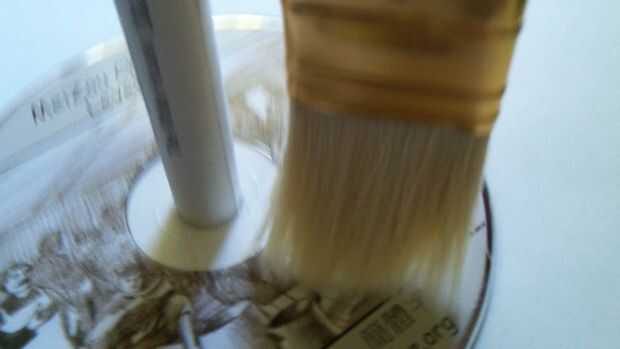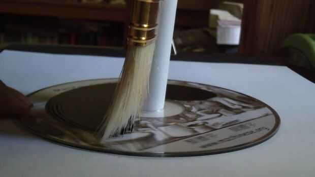 El pincel crea cantos que simulan los bordes de un disco de vinilo. Una vez que estés satisfecho con la aplicación de pintura, cuidadosamente retire el cepillo y lavar la pintura de él. Esperar que la pintura se seque. No te recomiendo con el secador como el movimiento del aire puede estropear las crestas.