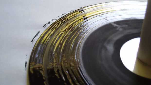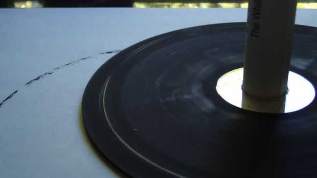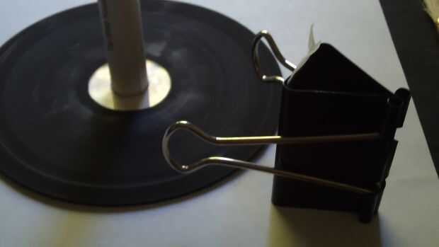 Una vez que la pintura se seca, toma el clip binder el tubo y extraiga el CD de la plataforma. Observe cómo a acrylicc pintura crea crestas como las crestas en un disco de vinilo.