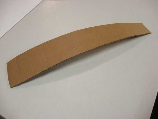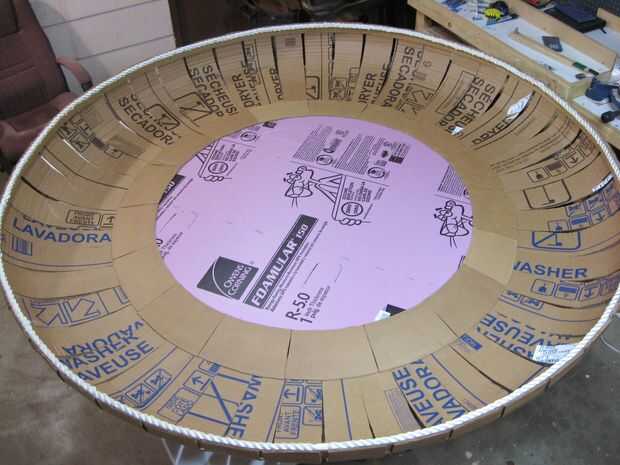 Cerca de 24 pies de cuerda de poliéster de 1 pulgada estaba caliente pegado en su lugar a lo largo de la banda de cartón. También he añadido algunos pedazos en la parte inferior del disco de espuma para proporcionar adicional soporte de cartón para las piezas de cartón de la cuña.