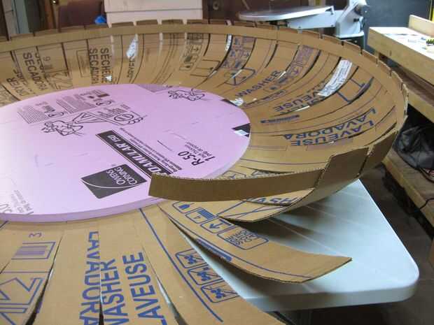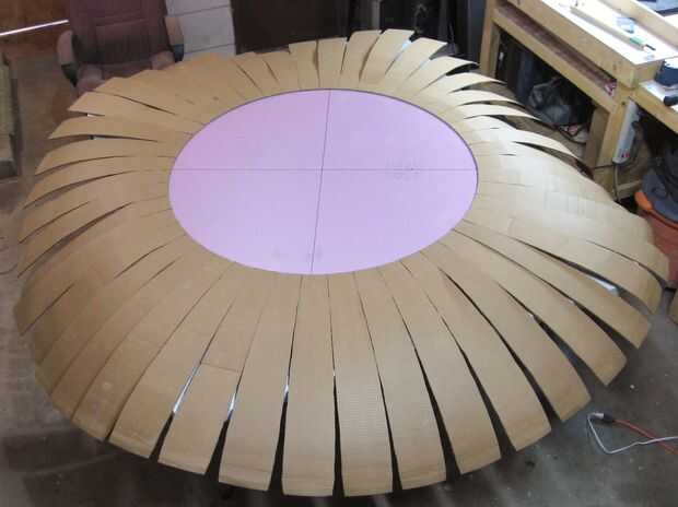46 piezas en forma de cuña de cartón se utilizan para crear la parte exterior del disco. Cada una de estas piezas de cartón eran tediosamente corte, arrastrado sobre el borde de una mesa para los rizos un poco y luego pegar en el borde superior del disco de espuma.