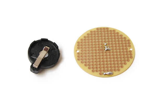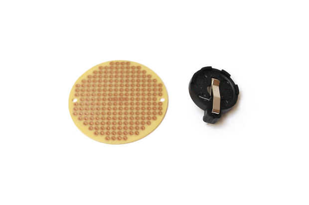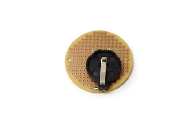 Destacan el soporte de la pila a la tarjeta de circuito impreso redonda de 1,75", de tal manera el soporte se encuentra en el mismo lado los pies de soldadura de cobre.