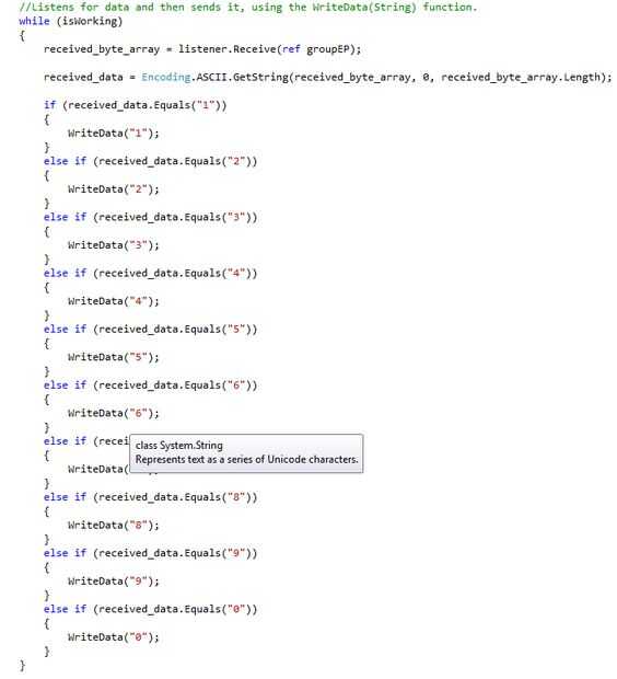 Cuando se presiona el botón listen, un nuevo hilo se inicia y escucha las conexiones UDP en el puerto 11000. Cuando se ha recibido datos analizar los datos y hacer modificaciones al mismo según sea necesario. Una vez realizada cualquier modificación enviará a la Junta de la hélice.