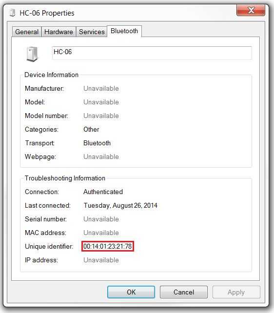 Haga clic derecho sobre el icono de bluetooth en la bandeja y haga clic en "Mostrar dispositivos de Bluetooth". Haga clic derecho sobre HC-06 y haga clic en propiedades. Ir a la pestaña Bluetooth y copiar el número de identificador único y pegue en el lugar de XX.