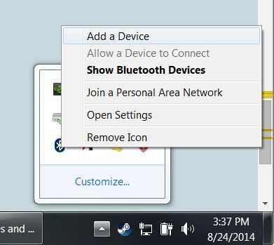 - Click derecho en el icono dispositivos Bluetooth en la barra de la bandeja y haga clic en Agregar nuevo dispositivo.