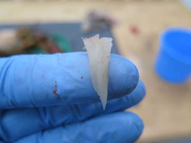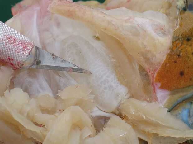 Dentro, podrás ver la matriz de pluma de las agallas. Son hermosas. Si usted toma hacia fuera, puede ver cuánto superficie tienen como se hacen de muchos filamentos tenues agruparse. Esto se optimiza para tirar de oxígeno en el agua salada en que vive. Si tienes un microscopio, la use para las branquias. Se ven increíbles.